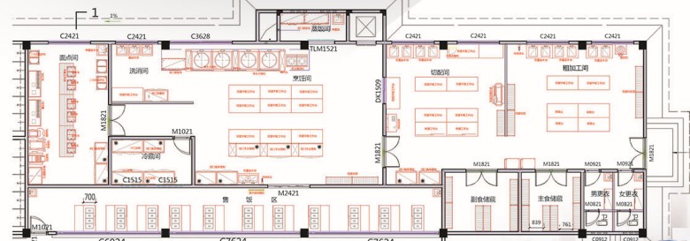 根據(jù)工作實(shí)際需要選用設(shè)備,按照工藝流程順序布局設(shè)備,確保工作流程順暢。設(shè)計(jì)中需要考慮人員運(yùn)動(dòng)、操作動(dòng)作、物流順序,按照工作流程流水線運(yùn)作,減少無效勞動(dòng),使物流生熟分開、潔污分離。例如,粗加工間一進(jìn)門就應(yīng)設(shè)有菜架、冰柜,原料進(jìn)入工作間,要有存放位置;其次就要有撿摘、清洗的工作臺(tái)、洗菜池、垃圾車,以及凈菜存放位的貨架、運(yùn)送的車輛。