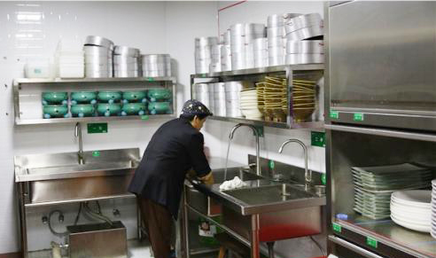4、洗碗間應(yīng)有可靠的消毒設(shè)施。洗碗間不僅僅承擔(dān)清洗餐具、廚房用具的責(zé)任,同時(shí)負(fù)責(zé)所有洗滌餐具的消毒工作。而靠手工洗滌餐具的洗碗間,則必須在洗滌之后,根據(jù)本餐廳的能源及場(chǎng)地條件等具體情況,配置專門的消毒柜。消毒這后,再將餐具用潔布擦干,以供餐廳、廚房使用。
