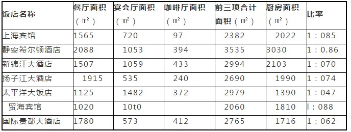 表2 為幾家著名飯店餐廳、宴會廳、咖啡廳與廚房面積統(tǒng)計(jì)