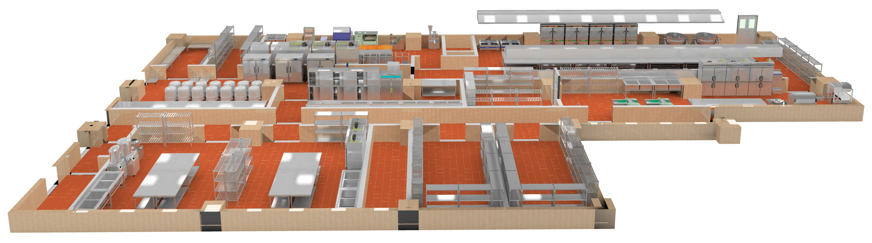 以主通道位置與走向?yàn)橹鞲擅},貫穿廚房,連通其他工作間,按照工藝順序確定其他工作間的位置,也就是各工作間按庫(kù)房、粗加工間,主副加工間、涼菜間、備餐間、洗碗間,餐廳的工藝流程順序布局,并與主通道連接順暢。在有條件的廚房中,應(yīng)該把各種工作間分開,特別是主食、副食、涼菜、洗碗、粗加工間要分開,把出餐與收殘出入門和路徑分開。只有把位置關(guān)系確定得合理通暢,保出餐和收殘的工作流程,減少無效勞動(dòng),才能提高工作效率。