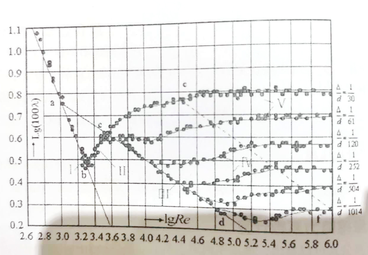 IV區(qū):紊流過渡區(qū)。隨著雷諾數(shù)的增大,各種不同粗糙度的曲線開始離開cd曲線,摩擦阻力系數(shù)逐漸增大,當增加至圖中虛線位置時各曲線開始與lgRe軸平行。在cd線與虛線中間的區(qū)域為第Ⅳ區(qū)。該區(qū)摩擦阻力系數(shù)可用柯列勃洛克公式計算。