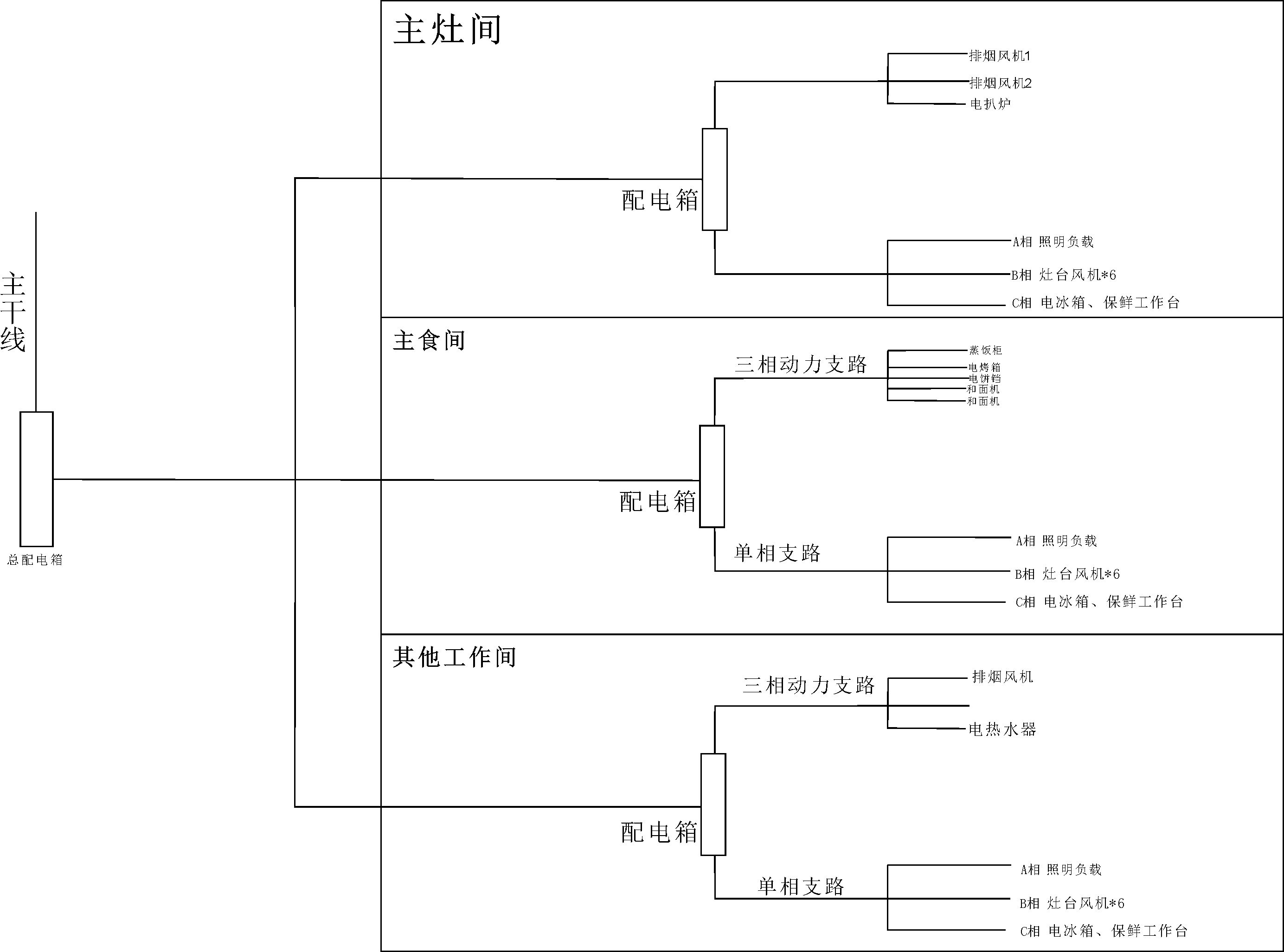 廚房供電系統(tǒng)用電負荷分為單相負荷與三相負荷、單相負荷主要為照明電,單相插座以及其他額定電壓為220V的電器用電。用電負荷的額定電壓均為單相220V,均勻分布到A、B、C三相。這類負荷也叫作相負荷。一般分為兩個獨立的系統(tǒng):照明系統(tǒng)和220V單相負荷動力系統(tǒng)。單相負荷動力系統(tǒng)通過單相插座向電冰柜、絞肉機、保鮮作臺、灶臺風機供220V動力電。380V三相負荷,分別供電到各個工作間額定電壓為380V的動力支路,主要供蒸飯柜、傳菜電梯、電熱開水器、排燈風機等廚房設備用電,線路不宜和其他獨立控制的設備接在同一個分支回路。具體情況見下圖: