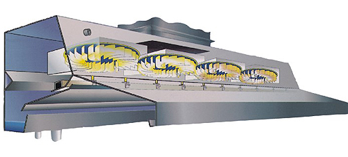 在風(fēng)機(jī)葉片上設(shè)置特殊水霧化結(jié)構(gòu),在引風(fēng)的同時(shí),霧化洗滌液體,凈化流經(jīng)風(fēng)機(jī)的油煙。由于霧化密度、粒度與轉(zhuǎn)速相關(guān),當(dāng)風(fēng)機(jī)轉(zhuǎn)速較低時(shí)霧化效果下降,轉(zhuǎn)速高時(shí),霧化效果和凈化效果要好一些。水循環(huán)需要水泵配合。對(duì)風(fēng)機(jī)増加水循環(huán)結(jié)構(gòu),必須采用耐腐蝕材質(zhì),在風(fēng)機(jī)前的管道內(nèi)仍然有積油,消防的效果要差一點(diǎn)。在北方冬季室外運(yùn)行存在設(shè)備防凍問題。