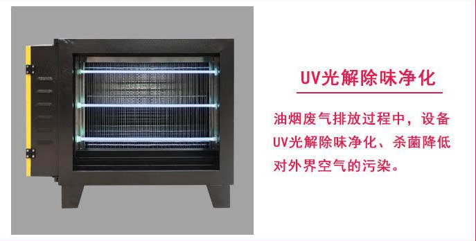 工作原理:利用UV紫外線光管發(fā)射高能C波段的光,紫外線光束改變油質(zhì)的分子鏈,并與空氣中的氧反應(yīng)產(chǎn)生臭氧,臭氧將油煙微粒降解成微量白色粉末、水和二氧化碳.形成冷燃燒,對(duì)煙道中的異味也具有氧化消除作用。通過(guò)排風(fēng)管道排出室外。這一技術(shù)易于安裝,凈化效率高,操作簡(jiǎn)便,維護(hù)和使用費(fèi)用非常低,無(wú)二次污染,在管道和排煙罩內(nèi)安裝,體積小,設(shè)置藝處理得當(dāng),風(fēng)阻小。由于光解反應(yīng)需要運(yùn)行過(guò)程,對(duì)風(fēng)速、煙道長(zhǎng)度都有具體要求、有的產(chǎn)品要求管道內(nèi)運(yùn)行長(zhǎng)度不能低于17m,有的要求更長(zhǎng)。紫外線光管對(duì)防潮和表面清潔有要求,還需要防止紫外線外射傷人。