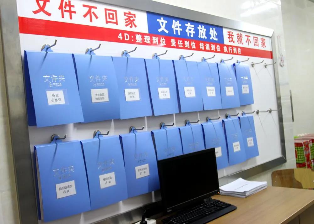 在智能倉儲(chǔ)室,所有的文件夾按規(guī)定排列在墻上,而所有的食材也是按規(guī)定整齊有序地?cái)[放著,“如果物品沒有按照要求的間距和位置進(jìn)行擺放,我們的智能倉儲(chǔ)管理報(bào)警器就會(huì)響,并直接反映到電腦終端,我們的管理員會(huì)第一時(shí)間看到,這就要求工作人員必須把所有的工作做到位?!备毙iL這樣介紹。