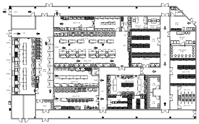 3.消防要求及考慮串味問題,廚房墻體必須砌筑到樓板底皮,餐飲廚房面積超過60㎡,必須裝設(shè)兩扇甲級防火疏散門;
