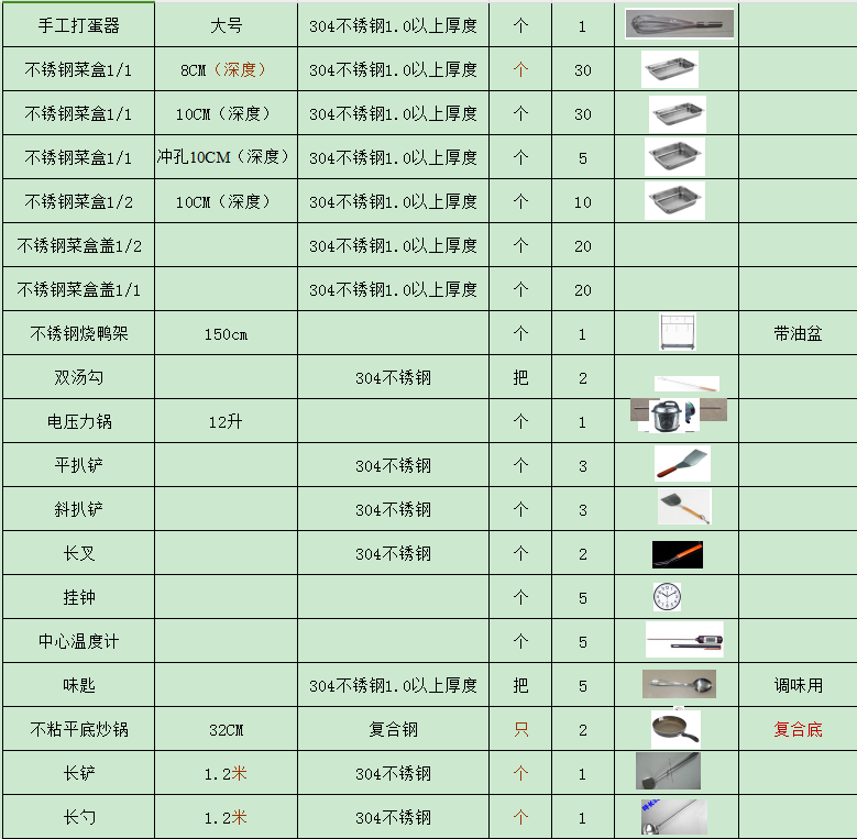 1、準確的廚房設備產(chǎn)品名稱。清單名稱闡述時盡量明確,如“雙頭小炒爐”不太明確,“燃氣雙頭雙尾小炒爐”就較為明確,不會產(chǎn)生疑問。