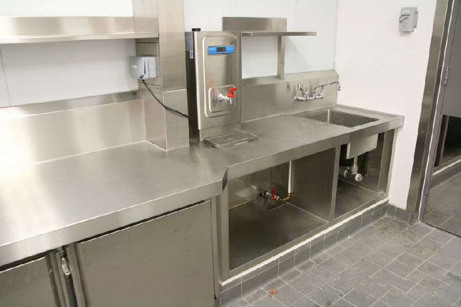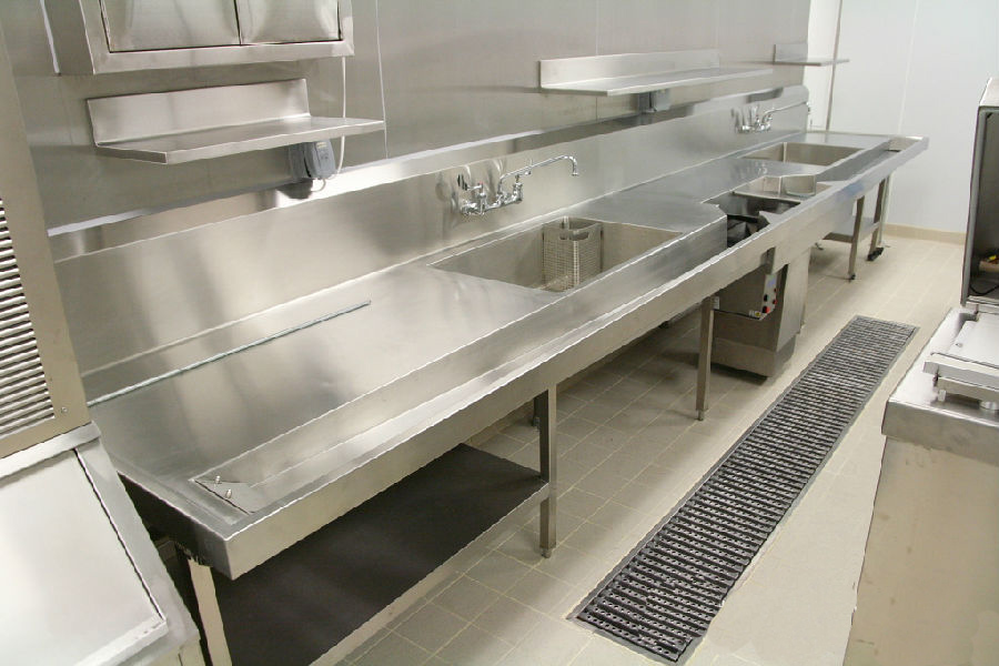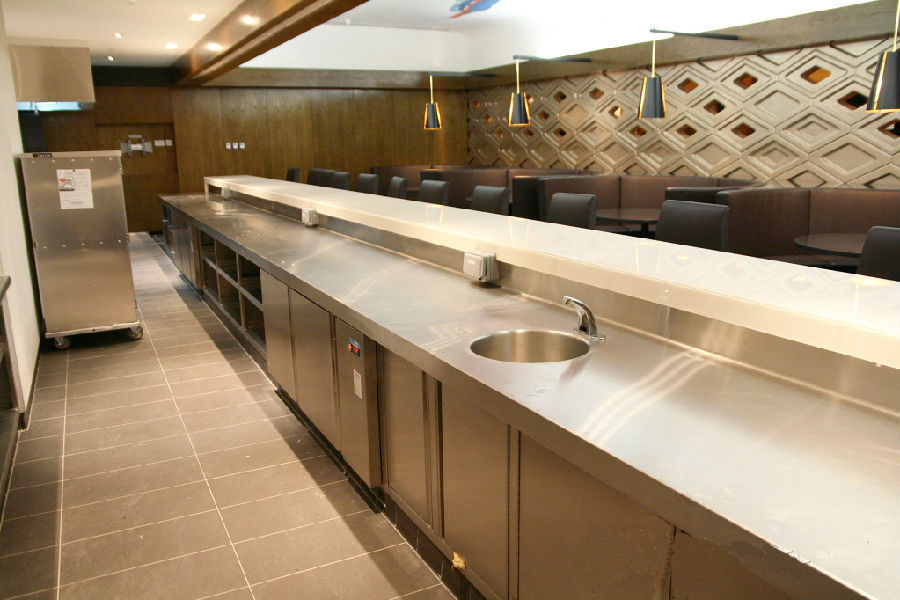 依然是一流的現(xiàn)場(chǎng)無(wú)縫焊接工藝,臺(tái)面非常平整,對(duì)土建(地臺(tái)施工),現(xiàn)場(chǎng)焊接工藝,調(diào)理臺(tái)的制造工藝要求非常高。工作臺(tái)的背板用大弧度L型設(shè)計(jì),避免藏污納垢,容易清洗。