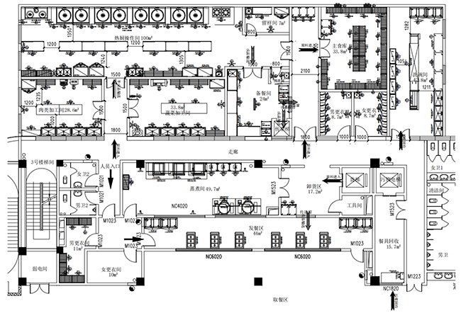 根據(jù)主通道位置與走向,以及各種工作流程走向,初步確定區(qū)域隔斷、進(jìn)出門(mén)位置。各種工作流程有各自的路線,根據(jù)各行其道、不交叉、不回流、不穿越無(wú)關(guān)區(qū)域的原則,確定進(jìn)料、出餐、收殘、餐具、垃圾的流程分通道。為保證工作流程快捷高效,要縮短傳送距離,截彎取直。較小的廚房若不能設(shè)分通道的廚房,也要利用運(yùn)行路線、運(yùn)行時(shí)間差,把不應(yīng)交叉的流程區(qū)分開(kāi),要達(dá)到各行其道、不交叉、不回流、不穿越無(wú)關(guān)區(qū)域的要求。