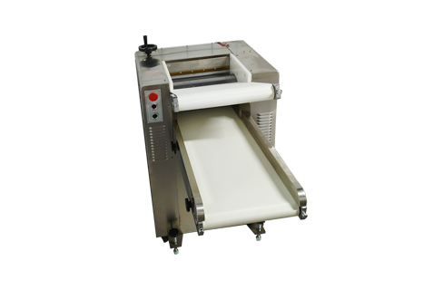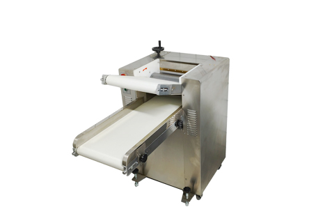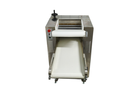 1.將定量面團(tuán)放在下輸送帶上,開動機(jī)器,自動輸送到軋輥間,面團(tuán)在輸送帶和軋輥作用下自動完成喂入和壓面過程。