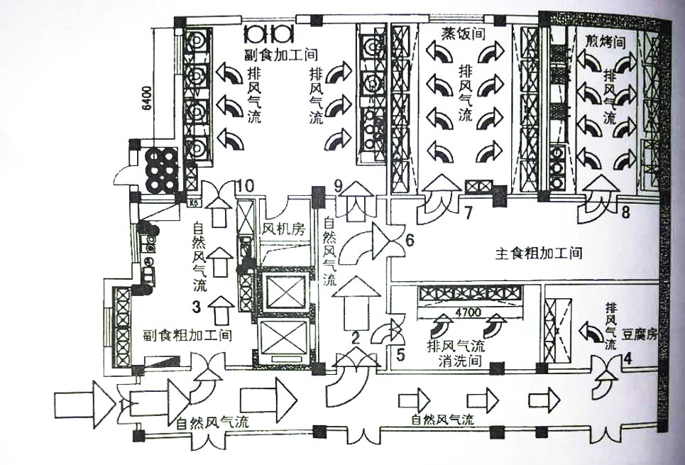 首先,圖一是一個學(xué)校食堂的半地下廚房,售飯區(qū)和明檔在二、三層,傳菜收殘全部用傳菜梯,廚房有一個出入口1號門。由于不補充新風(fēng),負壓太大,主食加工的蒸飯間和前烤間出入口7號、8號門關(guān)門后就很難打開,此時,下水道的污氣、污水回流。