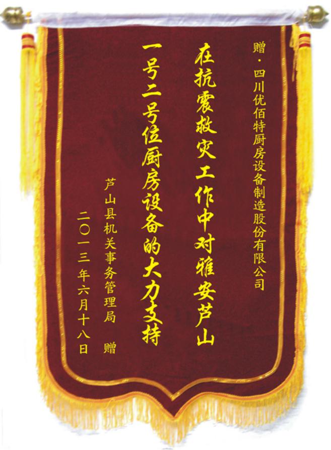 我公司2013年雅安蘆山地震中援建廚房設備,獲蘆山縣贈錦旗